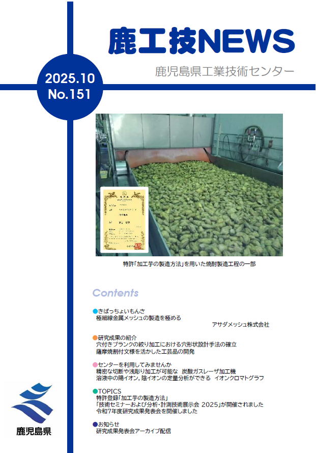 TOPICS | ・精密な切断や浅彫り加工が可能な炭酸ガスレーザ加工機 ・溶液中の陽イオン,陰イオンの定量分析ができるイオンクロマトグ ・特許登録「加工芋の製造方法」 ・「技術セミナーおよび分析・計測技術展示会2025」が開催されました ・令和7年度研究成果発表会を開催しました |